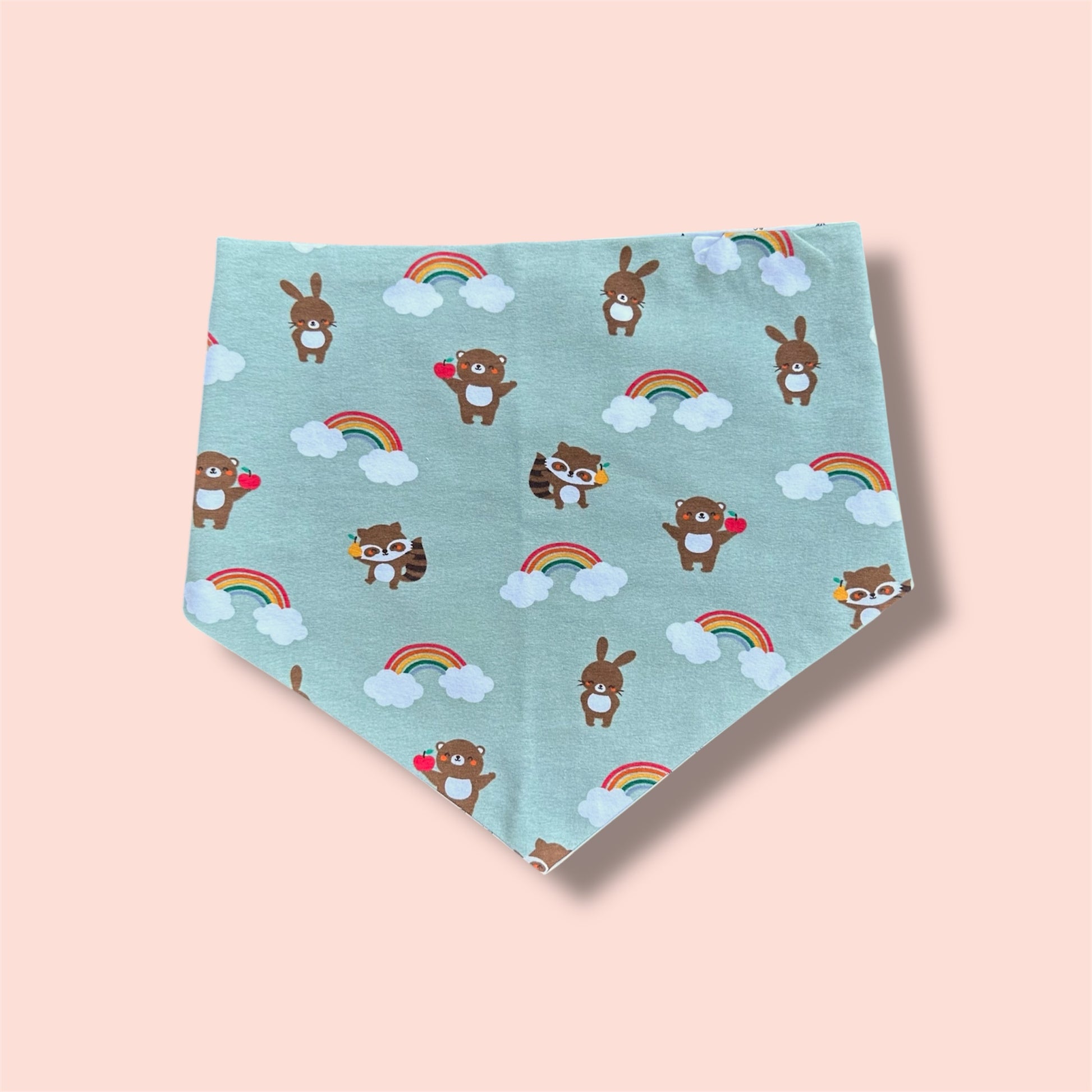 Aggiungi un tocco di dolcezza e colore al look del tuo cucciolo con questa bandana fatta a mano in morbida maglina di cotone! La stampa verde con teneri arcobaleni e simpatici animaletti rende questo accessorio unico e irresistibile, perfetto per ogni occasione.